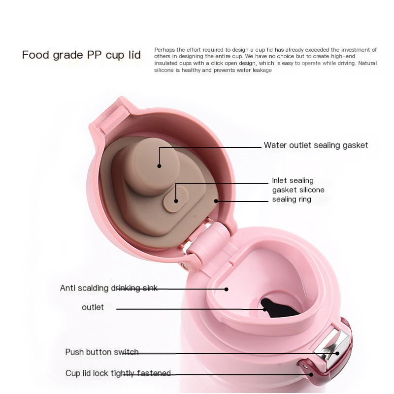 Coinníonn an airde 23cm go foirfe deoch 500ML, foirfe do chupán caife te ar maidin a mhairfidh go dtí an lón. Le haghaidh turais ghnó, pacáil thermos uisce te - gan athlíon níos minice le linn thiomáineann fada. Osclaítear an clúdach snap-on le 'cliceáil,' le gob óil i bhfolach a luíonn go foirfe do liopaí le haghaidh sip réidh. Cinntíonn an séala aerdhíonach aon sceitheadh fiú nuair a chlaontar bun os cionn le haghaidh éifeacht 'splashing uisce', agus luíonn sé go daingean i bpóca taobh do mhála droma.