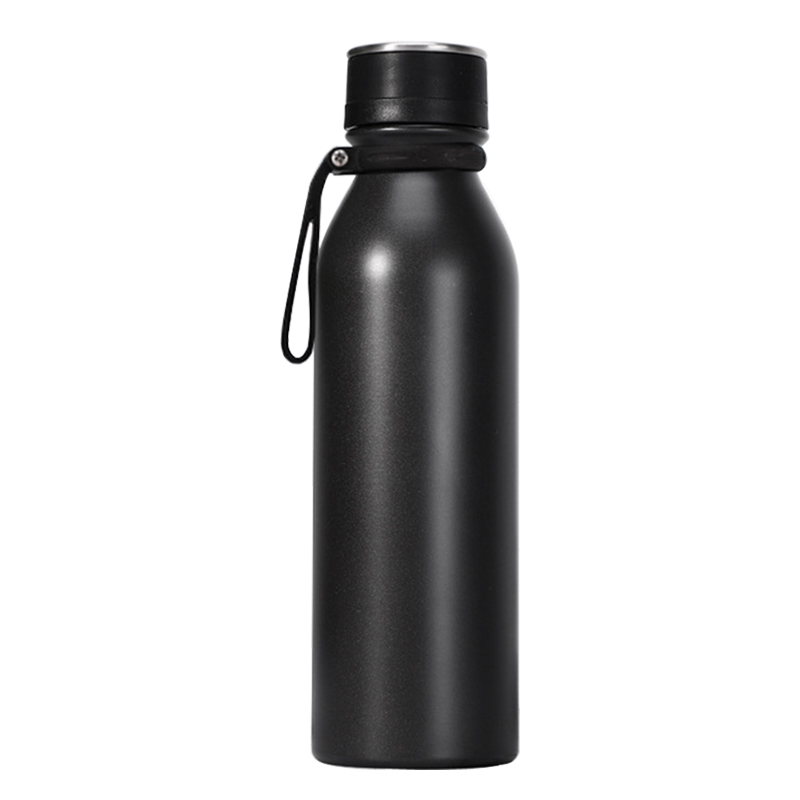 Is buidéal uisce cruach dhosmálta dubh é seo. Tá strap iompair ann le haghaidh iniomparthachta éasca. Tomhaiseann an buidéal 24 cm ar airde agus trastomhas 7 cm.