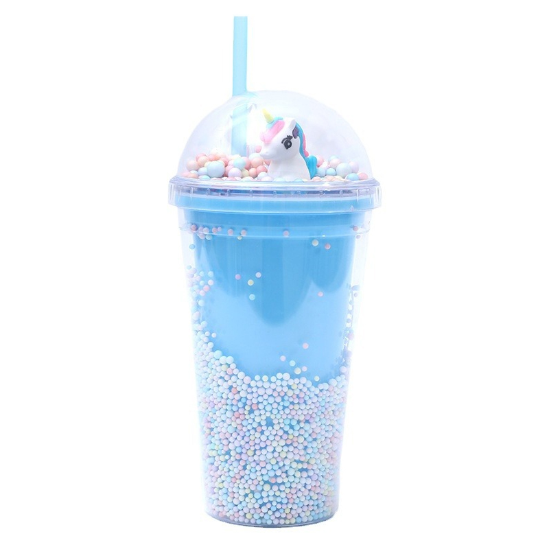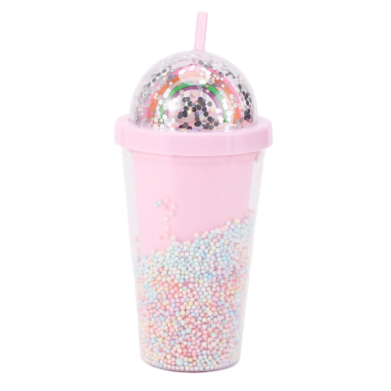 Is é an clúdach cruinneachán a ghoideann an seó: roghnaigh idir tuar ceatha glioscarnach (sluaiste le gliondar réalta) nó aonbheann beag bídeach 3D (suite i gcoirníní pastail) - tá sé cosúil le mionscéal fairy a iompar gach áit a dtéann tú. Tá balla dúbailte an chupáin líonta le coirníní pastel ar snámh agus glitter, mar sin gluaiseann sé le gach gluaiseacht (gan praiseach, ach draíocht!).