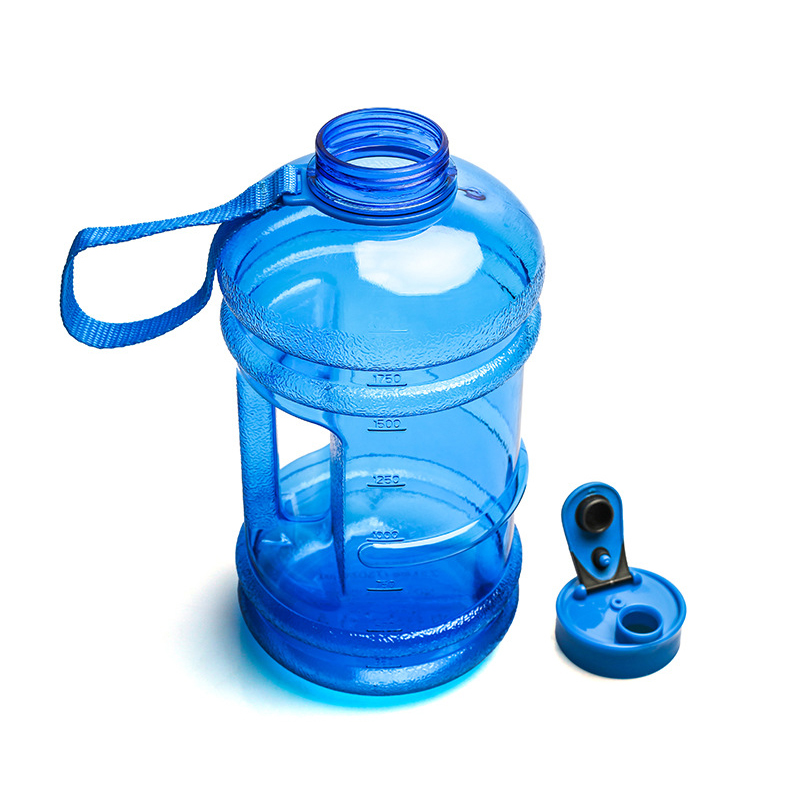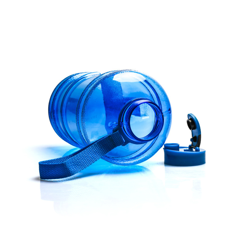 Tá roinnt sonraí tuisceanach sa bhuidéal uisce seo. Tá strap fite durable ceangailte leis, rud a chiallaíonn go bhfuil sé éasca é a iompar thart, rud atá áisiúil do ghníomhaíochtaí lasmuigh nó do úsáid laethúil. Tá dearadh smeach slán ag an lid; Nuair a osclaítear é, nochtann sé béal leathan, rud a cheadaíonn do líonadh go héasca le huisce nó le ciúbanna oighir a chur leis, agus glanadh a éascú freisin. Ní hamháin go mbreathnaíonn corp gorm trédhearcach an bhuidéil stylish ach ligeann sé duit leibhéal an uisce a sheiceáil go héasca.