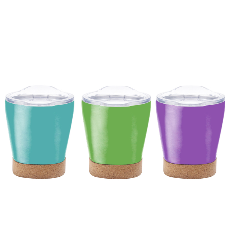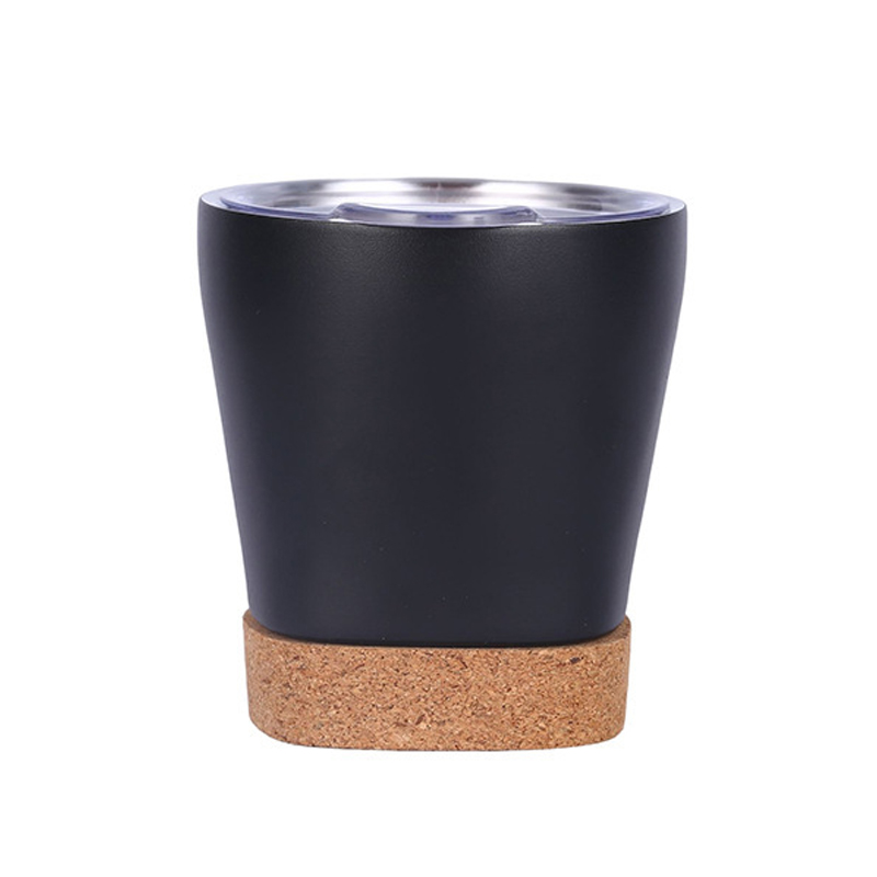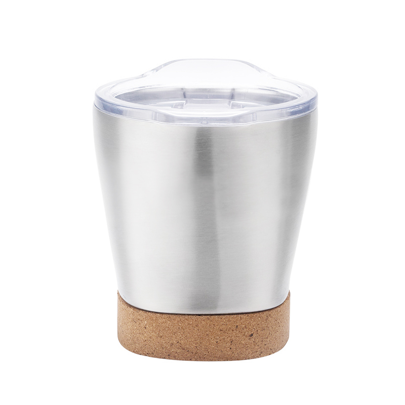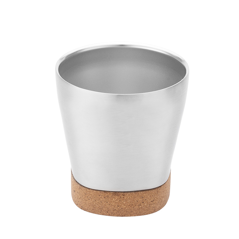 Tá an cupán seo crafáilte as cruach dhosmálta, agus tá scáthchruth sleek agus sreabhach le comhrianta cruinn sa chupán seo. Cuimsíonn a bhonn bonn bog corc donn a chruthaíonn codarsnacht shuntasach leis an gcorp cupán miotalach in ábhar agus i ndath araon. Ní hamháin go gcuireann an dearadh seo ambiance nádúrtha, te leis ach cuireann sé an aeistéitic fhoriomlán le simplíocht sofaisticiúil, rud a fhágann go bhfuil sé solúbtha go leor chun roghanna stíleála éagsúla a chomhlánú.